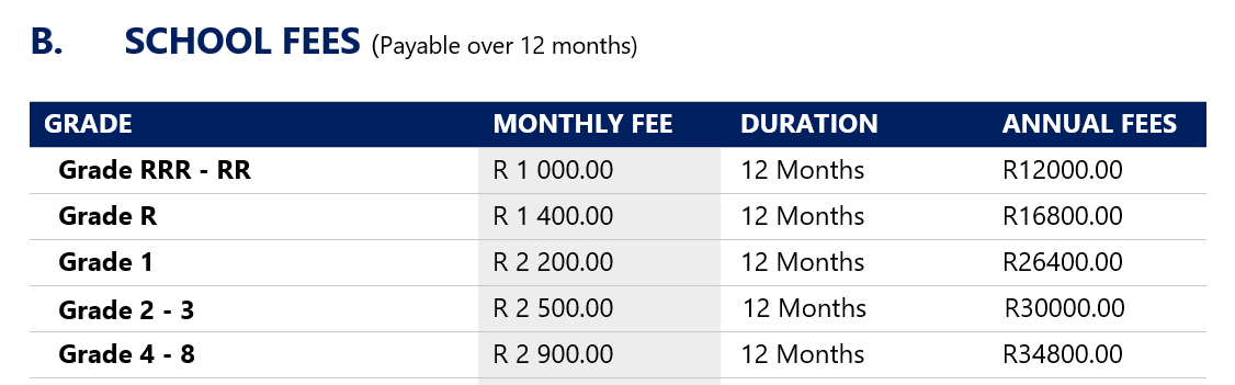 School fees are payable in advance monthly and arrear payments will incur penalties